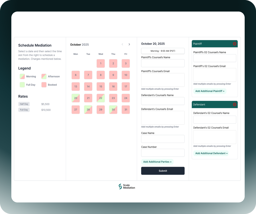 Everything you need to run your mediation practice — built into one intuitive platform. Scale Mediation simplifies how you get booked, manage cases, and delight clients, so you can stay focused on resolution, not administration.