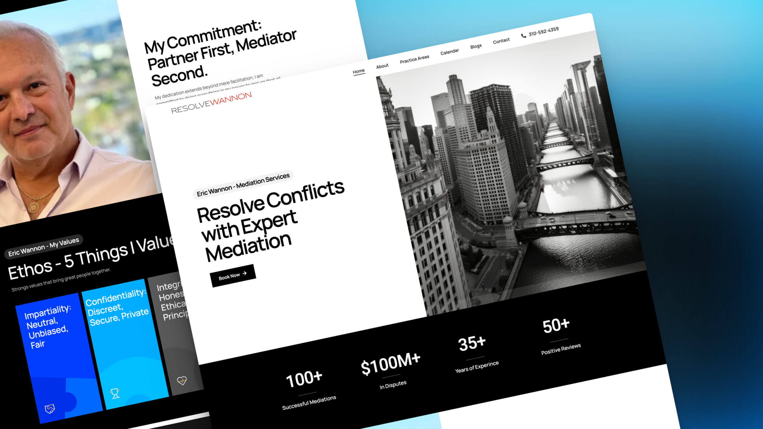 - Success Metrics Integration: Highlighted Eric Wannon’s impressive track record with statistics on successful mediations, the total value of disputes resolved, and positive reviews to build trust and credibility among site visitors. efficient process.